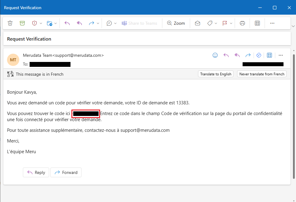 1. Similarly, choose the corresponding Request Verification Email Template (e.g., privacy-portal-request-verification-fr) to send the verification email in the same language.