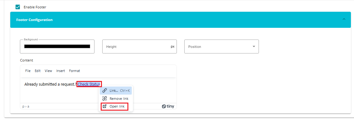 • If the link is placed in the footer, right-click on "Check Status" to edit it.
