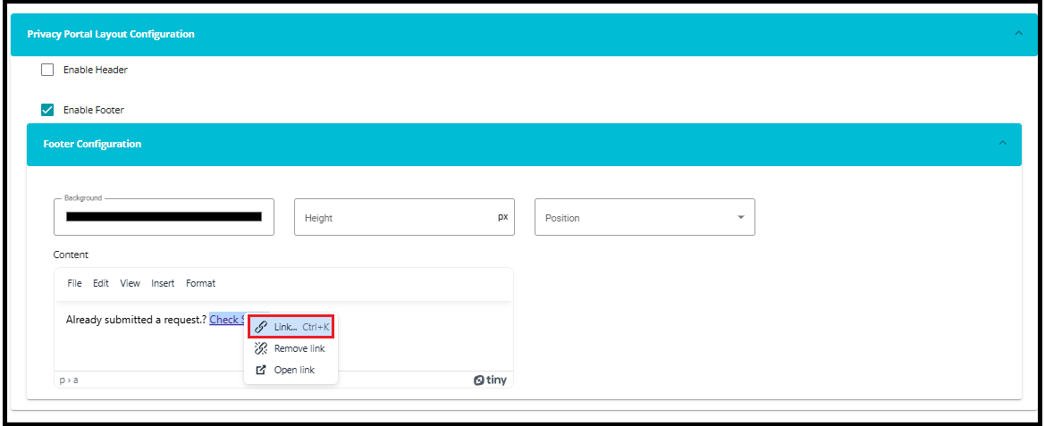 • If the link is placed in the header, first enable the "Edit" toggle, then right-click on "Privacy Portal" to make the necessary changes.