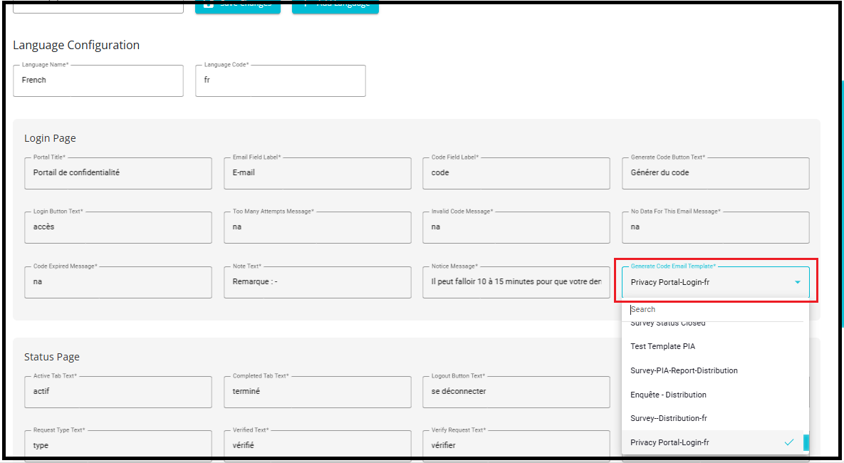 2. Select the appropriate language specific Generate code email template from the drop down. (e.g., privacy-portal-login-fr).